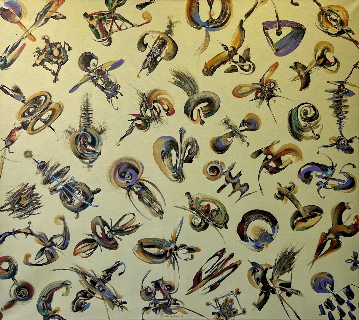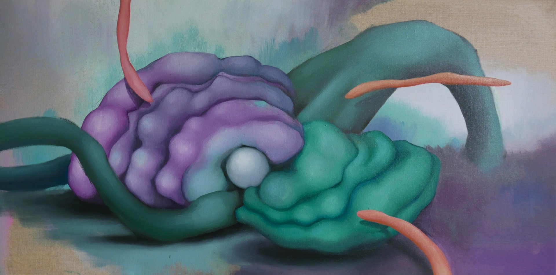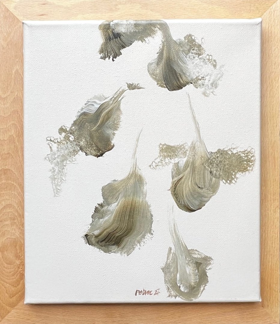 Výstava představuje setkání dvou autorů abstraktní malby. Miroslav Pošvic (*1959) se etabloval v oboru litografie, malba mu však dovoluje mazlit se s barvou, využívat její transparentnosti i plasticity, pohrávat si s modelací tvarů a jejich stínů, nořit se do hloubky prostoru. Jeho tvorba si vždy uchovává humorný nadhled, pracuje s nadsázkou. Na výstavě je k vidění i jeho litografie Snesitelná tíha bytí, která vyhrála na Grafice roku 2024. Alžběta Rajchlová (*1999) je mladá malířka, kterou lesy obklopující město, kde vyrůstala, inspirovaly k tvorbě vycházející z přírodního tvarosloví, které volně rozvíjí a nechává ho bujet ve fantazijních kompozicích. V práci s poloabstraktními tvary připomínající tajemné, dosud neznámé organismy ji ovlivnila také stáž na Novém Zélandu. Svou kolekci na tuto výstavu nazvala Vzpomínky na planetu uprostřed oceánu.